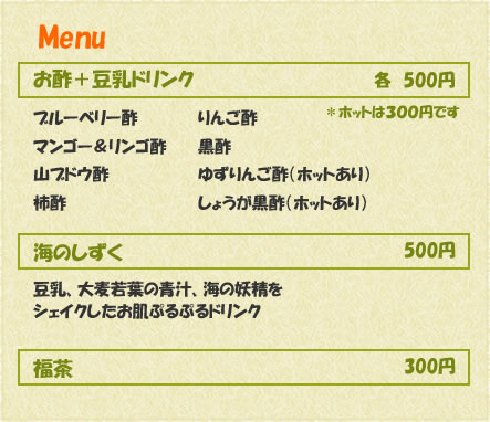 カフェメニューとしてお酢ドリンクをメインに提供しております。