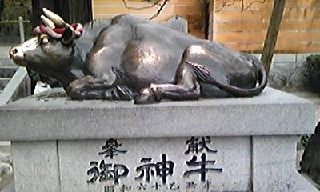 境内の入口付近まで歩いていくと、牛がお出迎え。